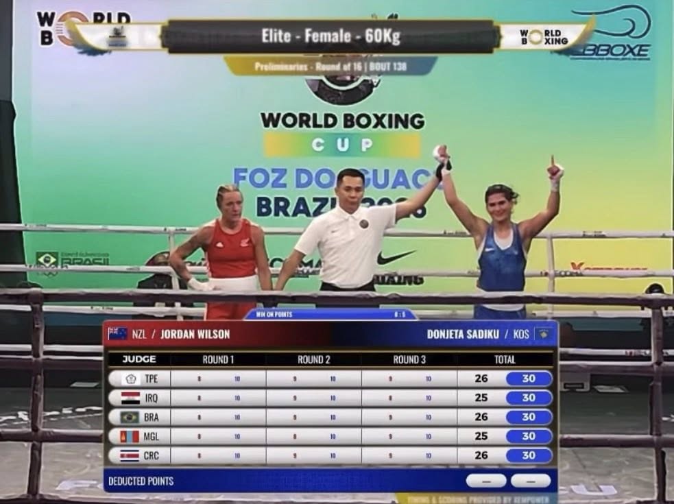 FITORE BINDËSE E DONJETA SADIKUT NË KUPËN BOTËRORE TË BOKSITFoz do Iguaçu, Brazil | 20–27 prill 2026 Mbrëmjen e 22 prillit, në kuadër të turneut prestigjioz “Kupa Botërore e Boksit”, boksierja kosovare Donjeta Sadiku (60 kg) shënoi një fitore bindëse ndaj përfaqësueses së Zelandës së Re, Jordan Wilson, me rezultat të pastër 5:0. Sadiku e nisi meçin fuqishëm që në raundin e parë, duke e sjellë dy herë kundërshtaren në…